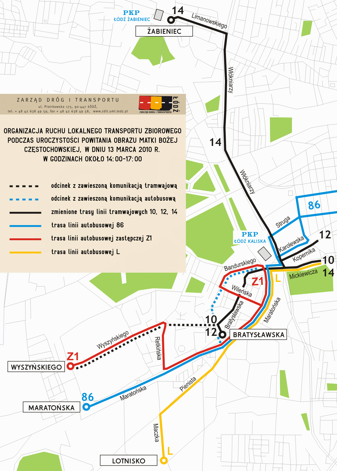 | W dniu 13 marca 2010r. w godzinach około 14:00–17:00, w związku z rozpoczęciem peregrynacji kopii obrazu Matki Boskiej Jasnogórskiej na terenie miasta Łodzi, ulegną zmianie trasy linii 10, 12, 14, 86, L |