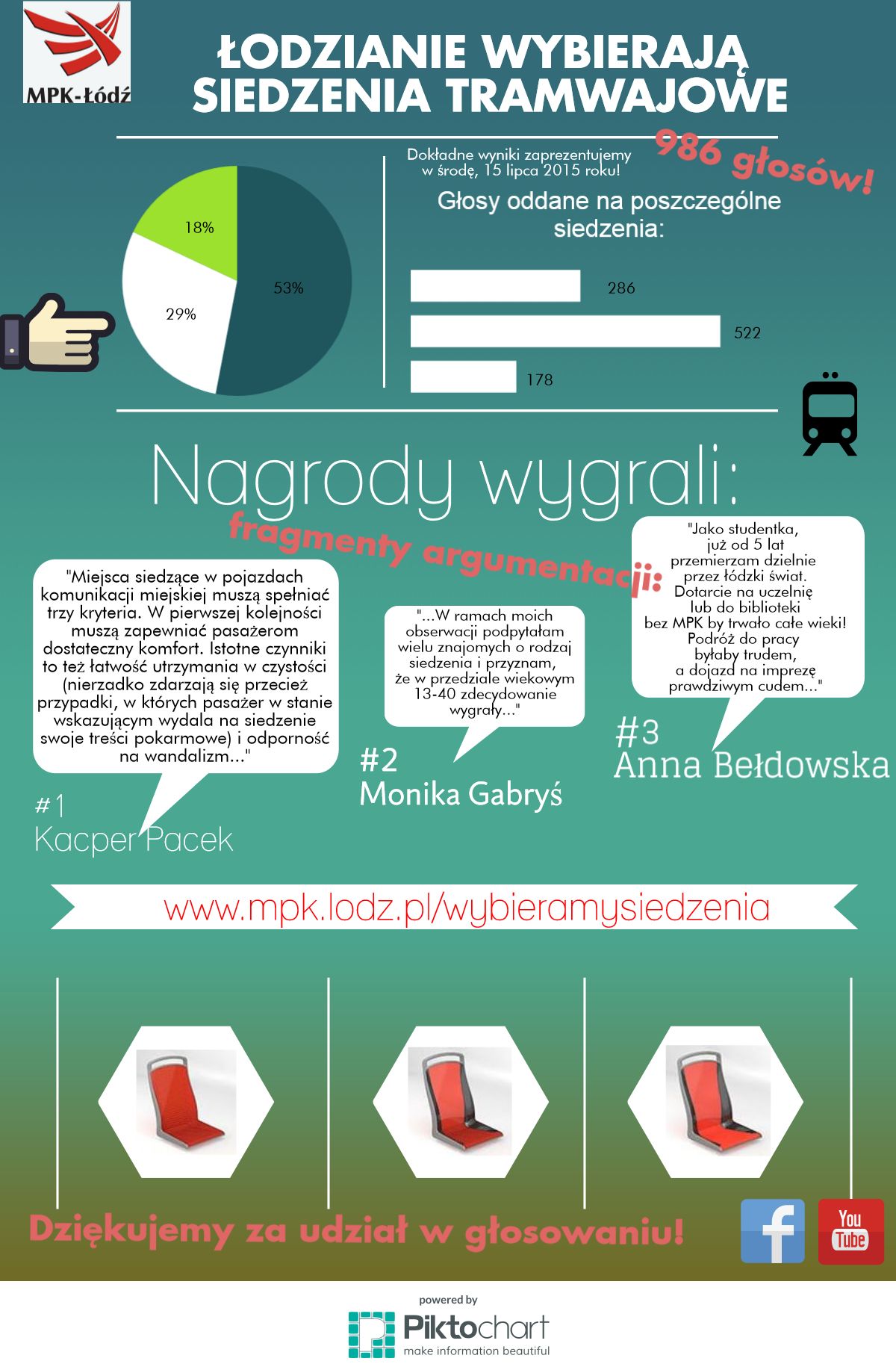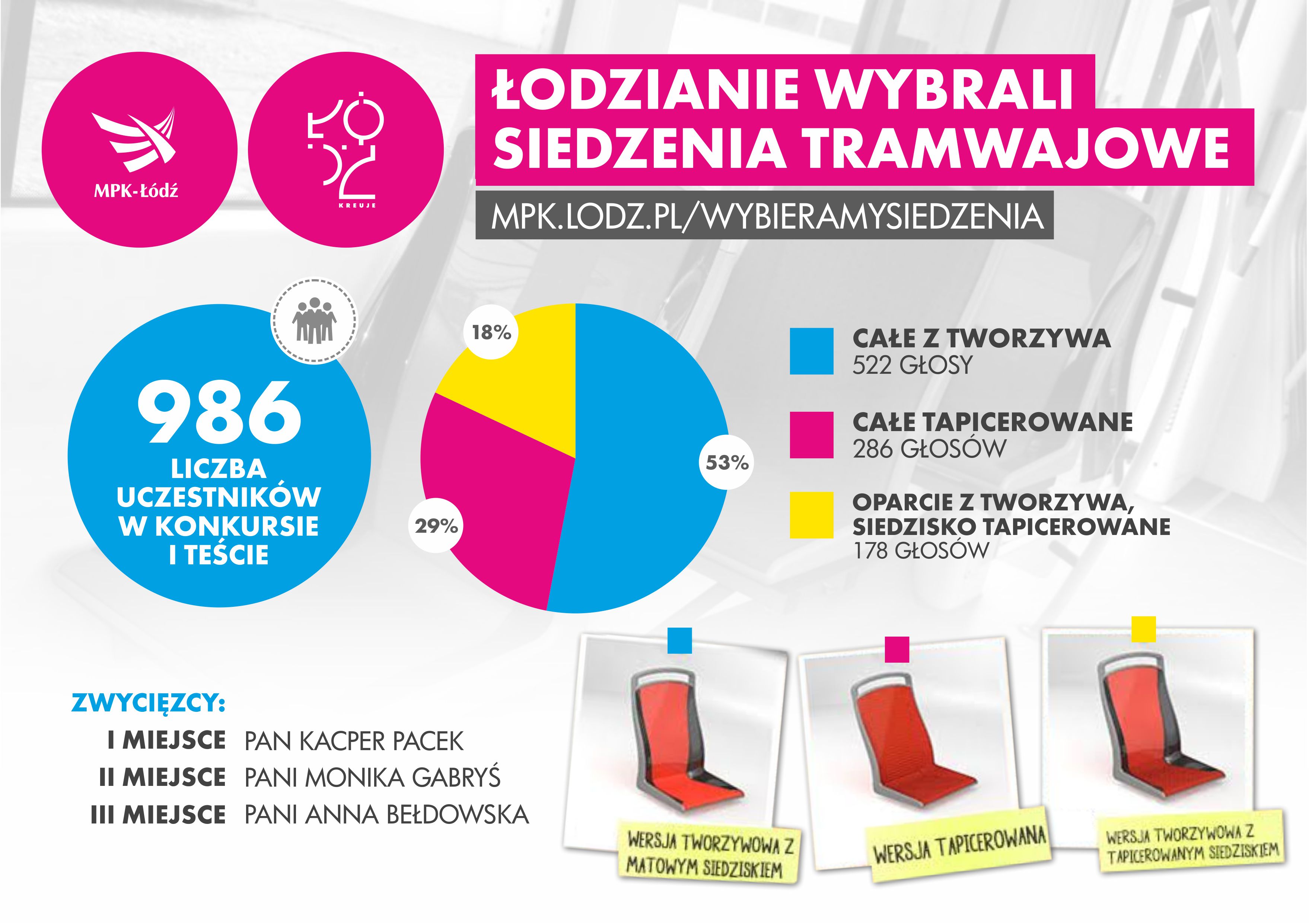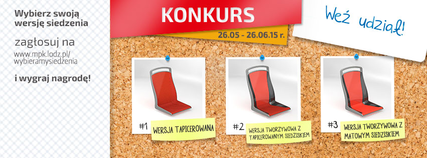 Informujemy również, że pełne wyniki dotyczące wyboru modelu siedzeń do tramwajów MPK-Łódź podamy do publicznej wiadomości w środę, 15 lipca. Wówczas odbędzie się również wręczenie nagród zwycięzcom.